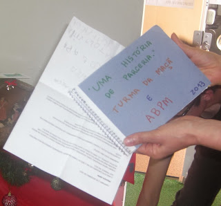Além do enfeite, ainda encontramos um livro com os desenhos e mensagens de gratidão dos alunos da Turma, com um detalhe especial: a capa do livro de desenhos foi produzida de uma caixa de maçã reciclada. Encontramos também um envelope com muitos desenhos, bem colorido, contendo uma carta afetiva desejando Boas Festas e agradecendo pela parceria formada.